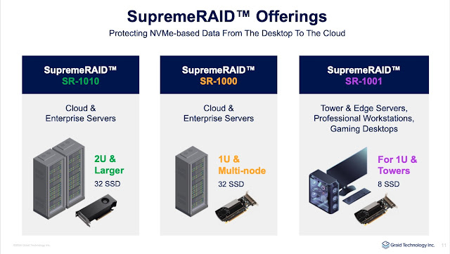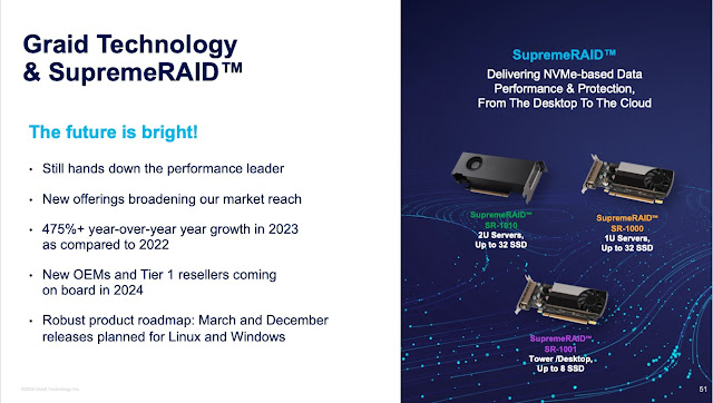 Graid Technology, the leading name in modern RAID controllers, unveils its latest innovation, the SupremeRAID SR-1001, catering to the surging global demand for NVMe SSDs across various storage segments, including primary and secondary storage, servers, and workstations. Boasting superior performance over traditional hardware and software RAID solutions, the SR product line gains widespread support from OS, NVMe SSD, processor vendors, and virtualization players, with versatile configurations for tower, edge servers, and workstations, and potential acquisition interest making it a standout in the storage industry. Read more: