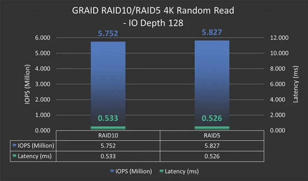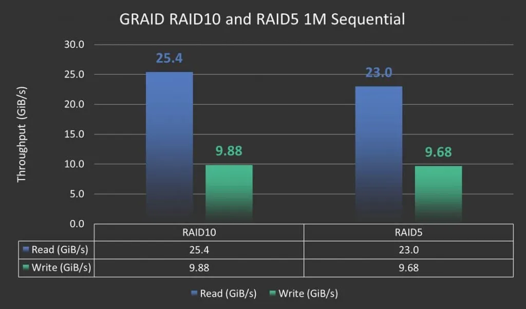 Finally, in the sequential read and write test, the throughput of RAID10 reads and writes can reach 25GiB/s and 10GiB/s respectively, which equals the total throughput of 10 NVMe SSDs, while RAID5 and RAID10 read performance is similar. And even with write penalties and checksum calculations, RAID5 write throughput can still reach 9.68GiB/s, which is very close to RAID10.