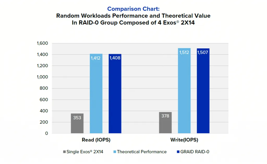 For the test, we will use The Flexible I/O Tester (FIO) which is an I/O performance benchmarking utility for Linux. We will set up 4k random workloads, a RAID-0 group composed of four Seagate Exos® 2X14 which can provide 1,408 IOPS random read and 1,507 IOPS random write. We will also use 1M sequential workloads, which can provide 1,874 MB/s of read throughput and 1,868 MB/s of write throughput. All results are very close to the theoretical performance of RAID-0 composed of 4 Seagate Exos® 2X14.