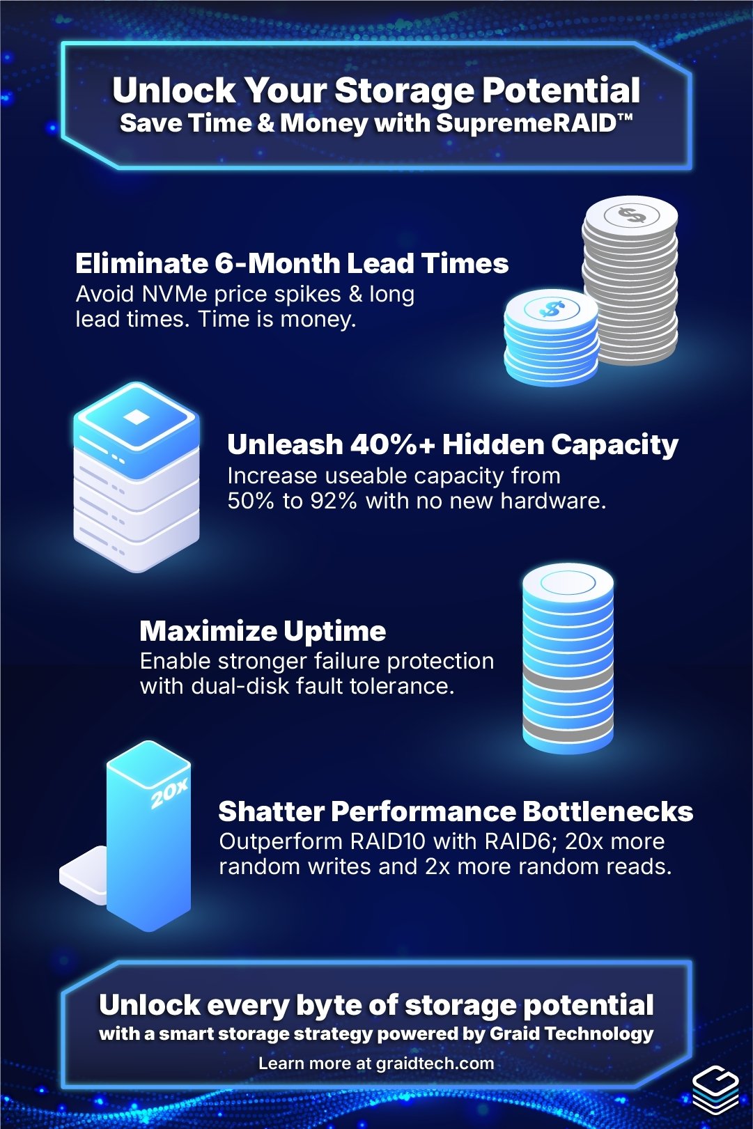 NVMe prices are spiking and supply is tight, so “just add more drives” is no longer a sustainable strategy. Traditional software RAID10 strands roughly half of your raw capacity in mirrors, forcing you to buy and deploy twice the hardware for the same usable space. With SupremeRAID™ RAID6, scaling storage becomes a software decision — not a 6-month procurement cycle.