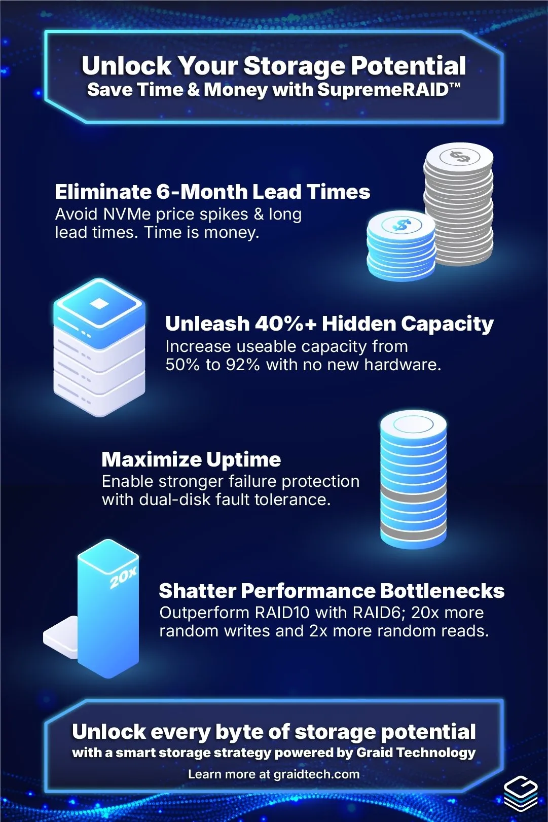 Unlock every byte of SSD performance with a Smart Storage Strategy powered by Graid Technology. Schedule a storage strategy consultation with our team and discover how SupremeRAID™ can help you reclaim capacity, eliminate bottlenecks, and reduce cost per usable terabyte. Use the form below or contact us at [email protected].