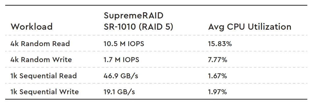 GPU-based Solution: By utilizing a GPU-based RAID solution like SupremeRAID, you can potentially mitigate or eliminate performance-related issues. Moreover, offloading RAID calculations to the GPU frees up valuable CPU cycles, enabling their allocation to other tasks. This also opens the possibility of considering lower-cost CPUs without compromising system performance.