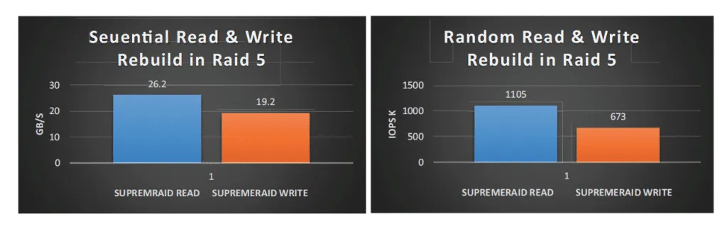 During the rebuilding process, the performance of sequential read and random read experiences a reduction of approximately 50%, which can be attributed to the increased traffic caused by the rebuilding activity. However, with the advantage of leveraging the computational power of GPUs, SupremeRAID exhibits a smaller drop in performance compared to other solutions. SupremeRAID RAID 5 efficiently maintains the rebuild throughput while simultaneously achieving equal or even higher levels of sequential write and random write performance. It is worth noting that open-source software-based RAID 5 configurations exhibit significantly lower performance due to the degraded reading and resource-intensive parity calculation tasks, which consume a substantial amount of CPU resources.