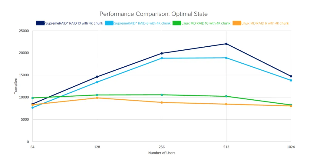 RAID Configuration*64 Users128 Users256 Users512 Users1024 UsersSupremeRAID™ RAID 10 8476.3914627.6219889.5622048.9014729.23SupremeRAID™ RAID 6 7669.5113408.2618813.2318878.6113807.17Linux MD RAID 10 9838.4510510.4210556.9810221.508269.07Linux MD RAID 6 8305.709872.398826.248455.828046.76* RAID with 4K chunks.