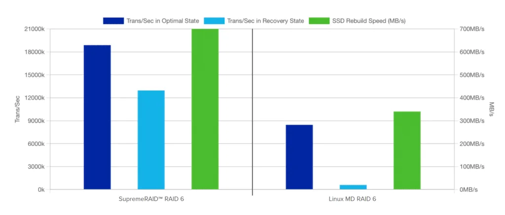 in Recovery StateSSD Rebuild Speed (MB/s)SupremeRAID™ RAID 10 22048.9016119.14880SupremeRAID™ RAID 6 18878.6112953.34700Linux MD RAID 10 15994.3810108.93420Linux MD RAID 6 8455.82598.75340* RAID with 4K chunks.