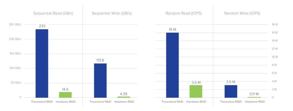 As shown in Figure 2, storage performance is negatively impacted by software RAID because reads and writes flow through the processor cores of the server. Bandwidth and IOPS are much slower than the aggregate speed of the SSDs, even though the SSDs remain connected to the server.