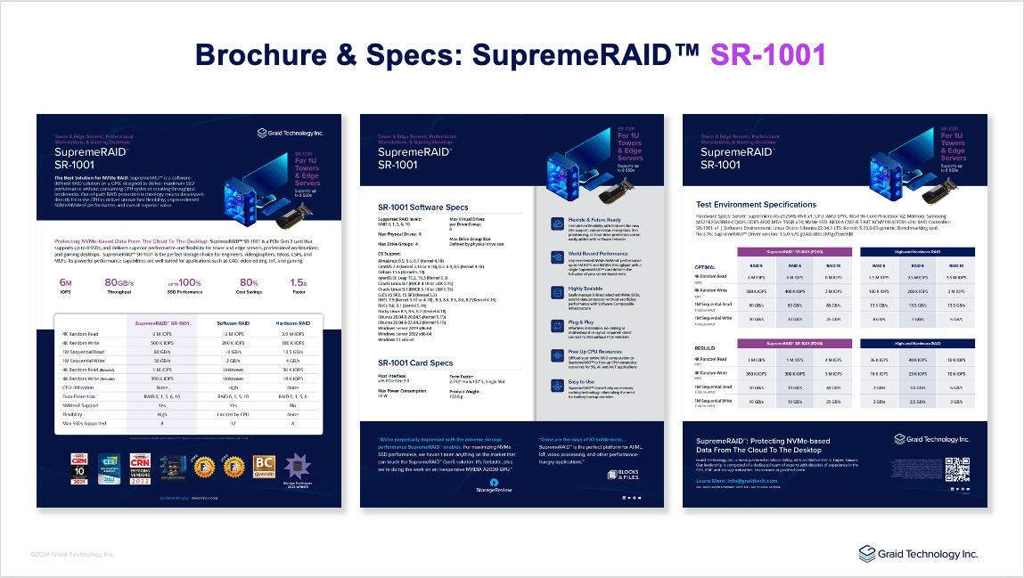 SupremeRAID™ Pro (formerly SR-1000) is a powerful, GPU-accelerated NVMe RAID solution designed for mid-scale enterprise data centers, offering exceptional RAID performance, scalability, and data resilience. Leveraging NVIDIA RTX A1000 GPUs, SupremeRAID™ Pro enables modern IT teams to maximize NVMe SSD speed, simplify management, and protect vital data.