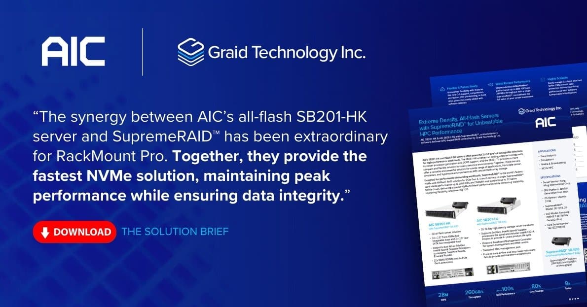 AIC’s powerful 2U 24-bay hot-swappable SB201-HK and SB201-TU servers are now combined with SupremeRAID™ SR-1010 to deliver extreme speed and data integrity for the most demanding high-performance workloads, such as:...