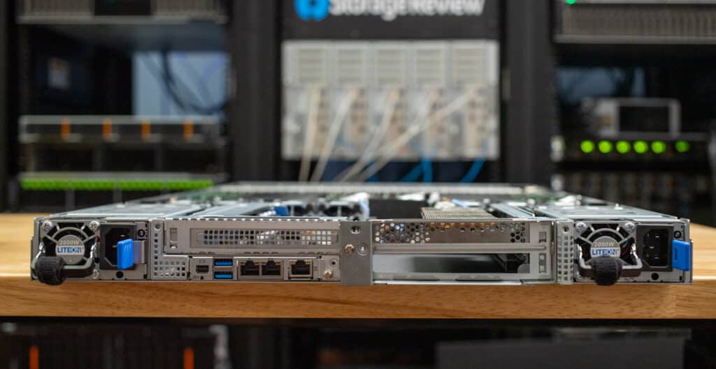 We used the Gigabyte S183-SH0-AAV1 dual Intel 5th Gen Scalable 1U server for this test bed. We wanted to find a compact server with plenty of computing power, and it just so happened that the server supports 32 E1.S SSDs, the maximum of what is supported with a single Graid SupremeRAID SR-1010. The Gigabyte server has 32 DIMM slots, with 96GB RDIMM and 256GB 3DS RDIMM support. This platform offers three FHHL PCIe Gen5 slots in the rear, giving plenty of options for high-speed networking connectivity. In addition, the motherboard provides dual 1GbE onboard networking and a 1GbE management port.