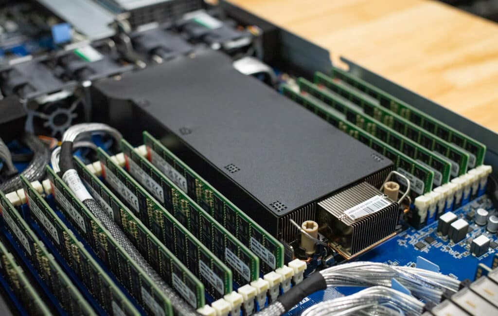 The server supports 32 DIMM slots, but in this case, we populated with 16 Kingston DIMMs, 1 DIMM per channel (1DPC) for maximum DRAM speed. Should the workload call for a larger footprint, moving to higher-density DIMMs or a 2DPC configuration is possible, but the latter drops DRAM speed to 4400MT/s. The Kingston 96GB DDR5-5600 ECC RDIMMs in this server provide an excellent blend of performance per dollar, making them an attractive option for workloads needing high-speed DRAM and a reasonable DRAM footprint without the cost premium of 128GB DIMMs. These modules offer the best of both worlds for intensive HPC and AI workloads.