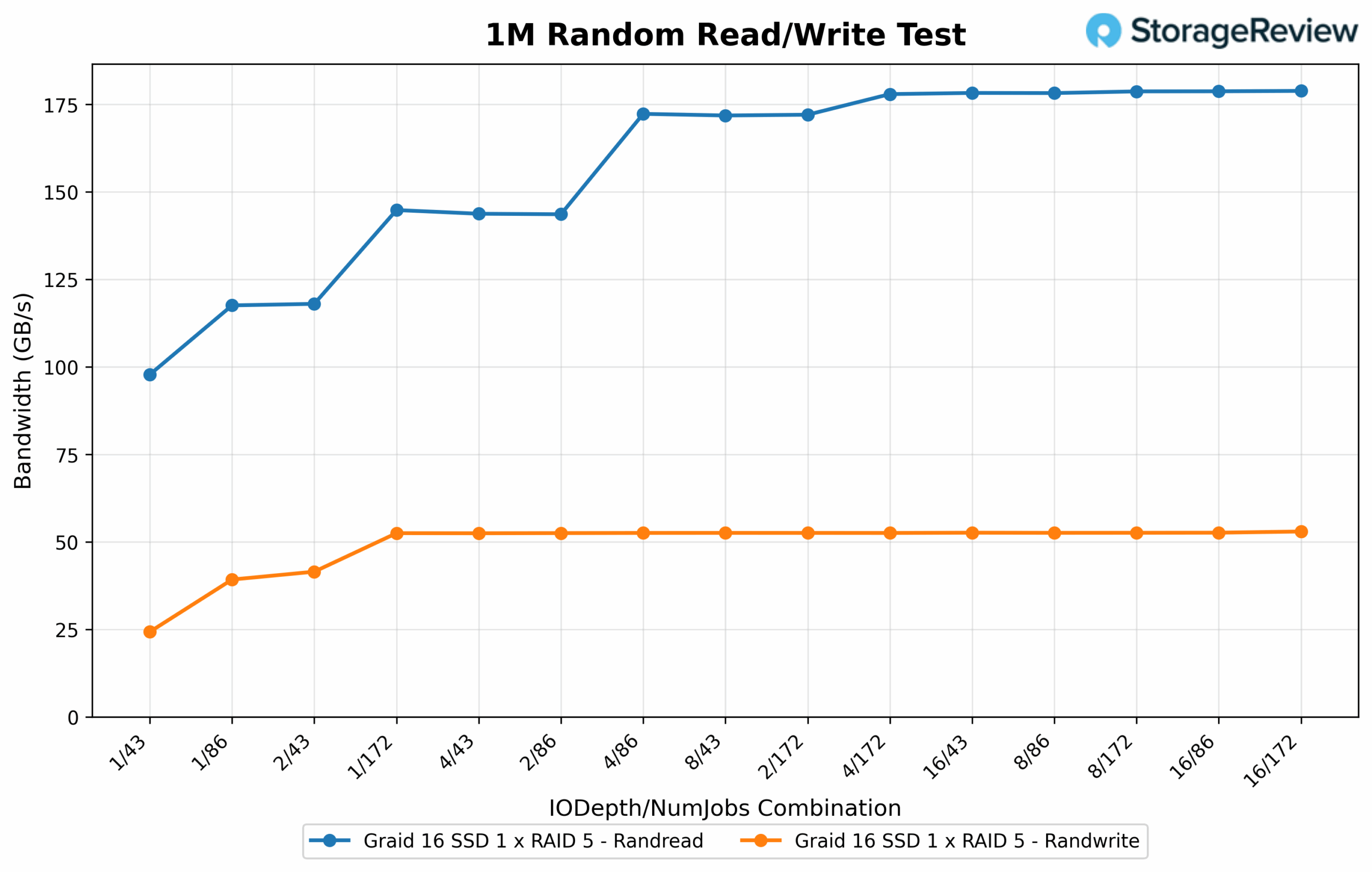 Moving to random 1M operations, read bandwidth led the performance curve by peaking at 183.60GB/s using an IO depth of 16 with 172 jobs, the most aggressive configuration tested. Similar high-throughput results were recorded at 8/172 and 4/172, both exceeding 182GB/s, which highlights the array’s ability to scale with increasing job count and depth. Even midrange configurations like 4/86 and 16/43 held strong, sustaining over 147GB/s, showing consistent read performance across varying levels of concurrency. Transitioning to writes, random 1M bandwidth reached a peak of 54.233GB/s at 8/172, with a near-identical 53.77GB/s at 2/86, validating efficient write scaling under parallel workloads. Performance scaled down smoothly in lower-thread combinations like 1/43 and 2/43, which produced 24.88GB/s and 42.48GB/s, respectively, still reflecting a strong saturation curve even at moderate concurrency levels.