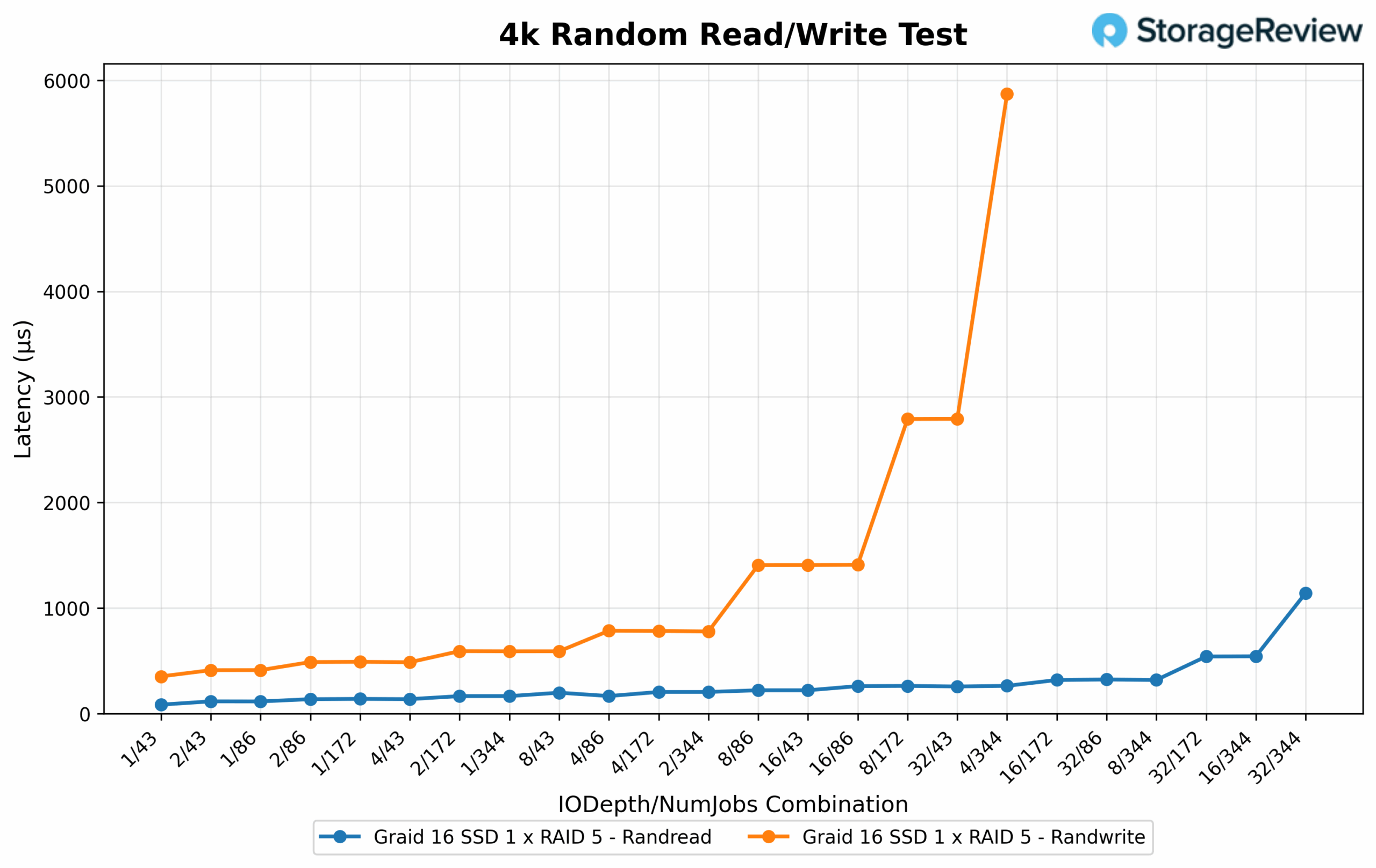 Random 4K read latency remained extremely low across the board. The fastest response time was 0.084ms at 1/86, with several other configurations—including 1/43, 2/43, and 4/43—all falling below 0.12ms. Even at peak IOPS, latency stayed well controlled, with the top-performing 32/344 configuration holding at just 1.142ms. This reflects excellent responsiveness, even as the array pushed to its maximum throughput potential. On the write side, random 4K latency was also well managed. The lowest value recorded was 0.352ms at 1/43, while other highly efficient setups like 1/86, 2/43, and 4/43 all stayed under 0.6ms. High-throughput configurations such as 32/172 and 32/86 saw latency rise modestly to between 2.79ms and 5.87ms, remaining within an acceptable range considering the sustained write saturation levels.